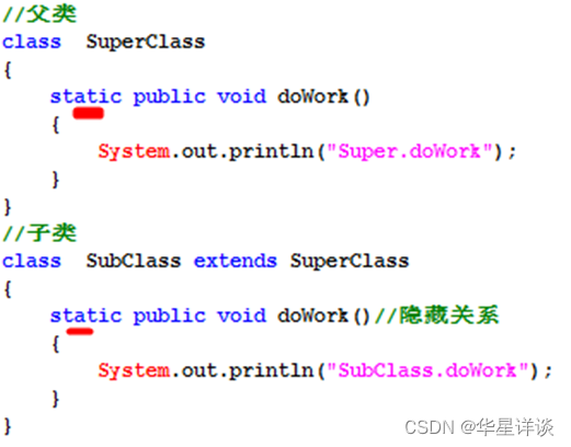 ① 满足继承的访问权限下,隐藏父类静态方法:若子类定义的静态方法的签名和超类中的静态方法签名相同,那么此时就是隐藏父类方法。注意:仅仅是静态方法,子类存在和父类一模一样的静态方法.
