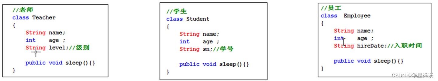 我们在上面的这三个类中,发现Teacher、Student、Employee代码中存在着共同的代码,每一次都需要重新写的话就会很麻烦,也不利于后续的扩展。那我们要如何解决代码重复的问题呢?这是就不得不说Java面向对象三大特性中的继承了。