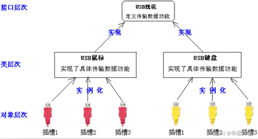 生活中,咱们说的USB接口其实并不是我们所看到的那些插槽,而是那些插槽所遵循的一种规范(标准)。USB是一种协议(规范):应该规范所有的USB设备具有某些功能。我们所看到的那些插槽是根据USB规范设计出来的产品,也就说插槽是USB规范的实例。对于不同型号的USB设备而言,他们各自的USB插槽都需要遵循同一个规范,如此可以保证任何插入插槽的设备都能与主板正常通信。对于同一种型号的主板上的多个USB插槽,他们有相同的数据交换方式,相同的实现细节,可认为他们都是同一个类的不同实例。
