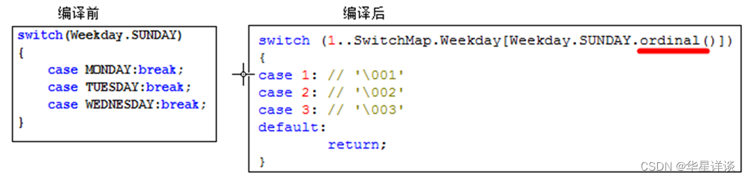 ⑥ 枚举实例后有花括号时,该实例是枚举类的匿名内部类对象(查看编译后的class文件)。