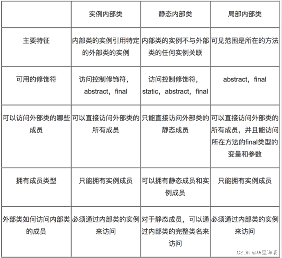 外部类的访问修饰符要么使用public,要么就缺省。内部类看做是外部类的一个成员,好比是一个字段,那么内部类可以使用public/缺省/protected/private修饰,还可以是static修饰。