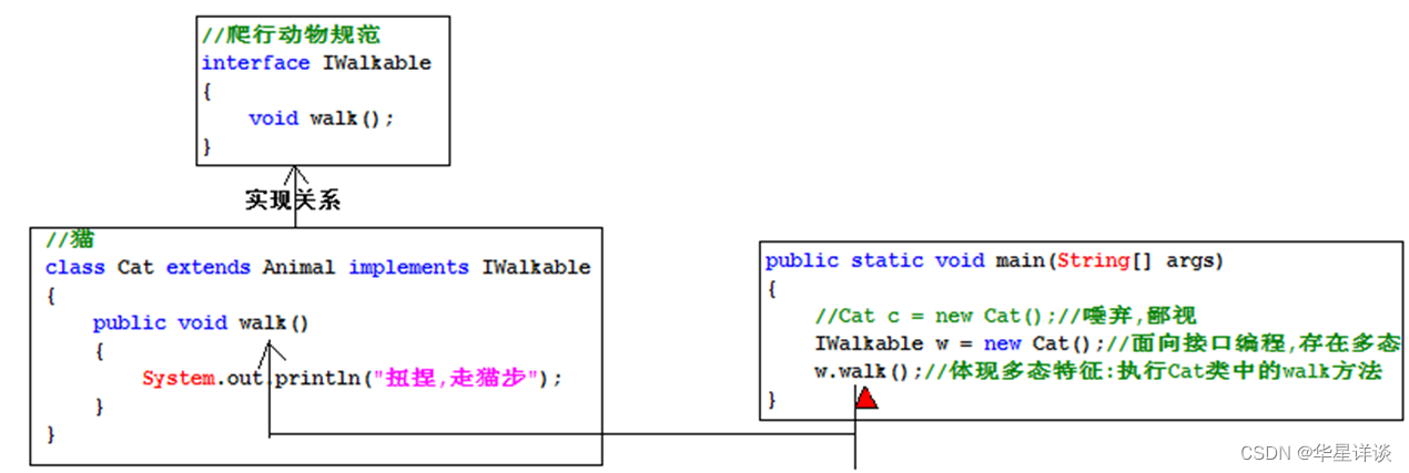 接口和实现类之间的关系严格上称之为”实现关系”,使用implements来表示;但是在开发中有时候为了方便也把这个实现关系称之为特殊继承关系。所以可以这样理解:接口是实现类的父类,实现类就是接口的子类。