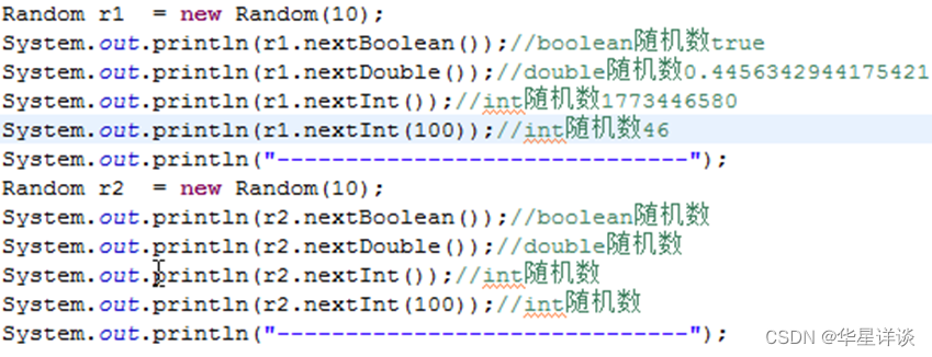 Random类:用于生产一个伪随机数(通过相同的种子,产生的随机数是相同的)。