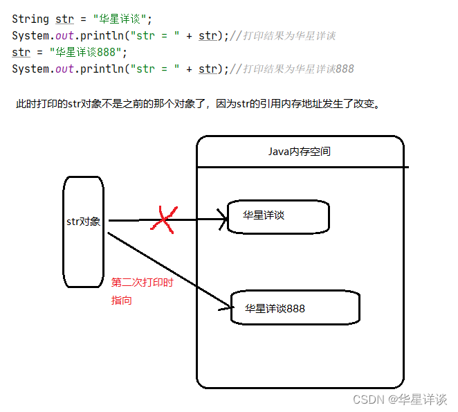 不可变的字符串:String。当前对象创建完毕之后,该对象的内容(字符序列)是不能改变的,一旦内容改变就是一个新的对象。