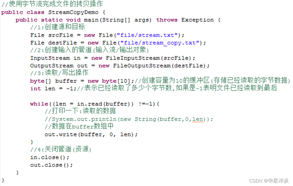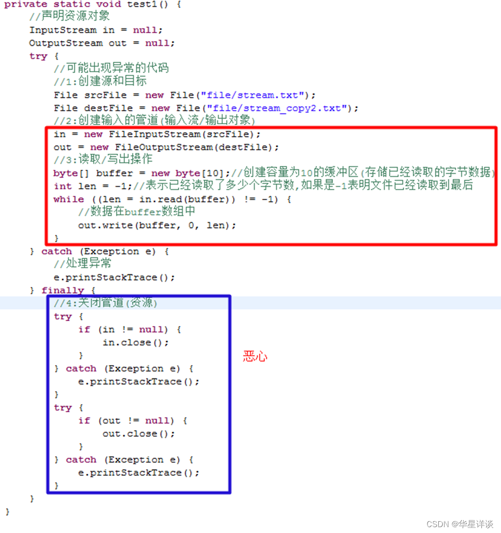 我们在在每一次的使用流之后都要进行关闭流,如下代码: