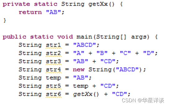4)使用包含String直接量(无final修饰符)的字符串表达式(如"aa" + s1)创建的对象是运行期才创建的,存储在堆中;通过变量/调用方法去连接字符串,都只能在运行时期才能确定变量的值和方法的返回值,不存在编译优化操作。