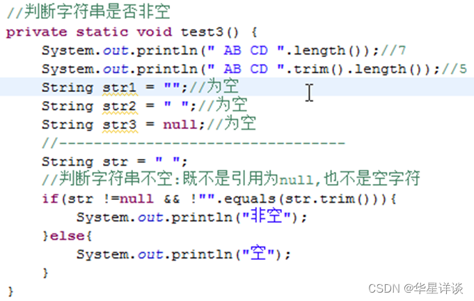 2)内容为空字符串: String str2 = “”; 以及初始化,分配内存空间,不过没有内容.