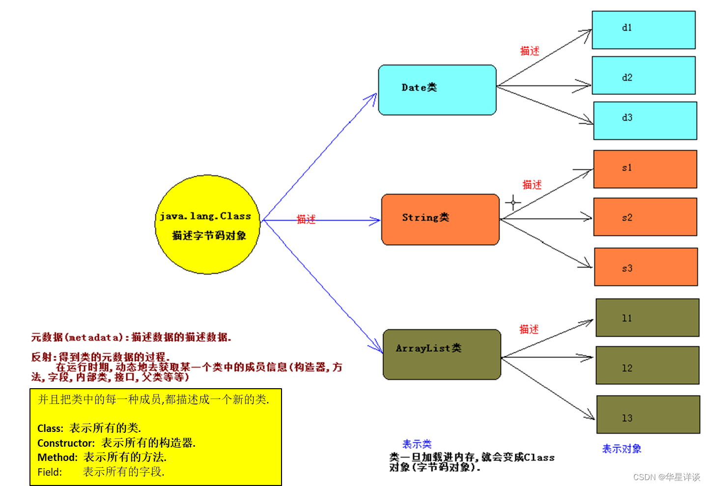 Class类的实例:指在JVM中的一份份字节码,Class实例表示在JVM中的类或者接口或者枚举。是一种特殊的类,注解是一种特殊的接口。