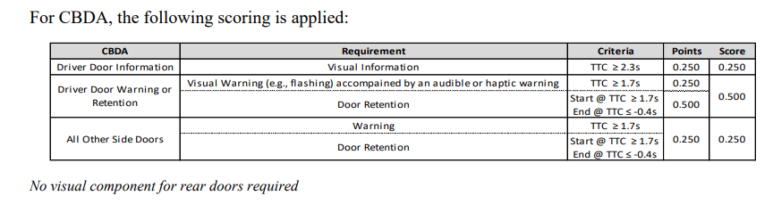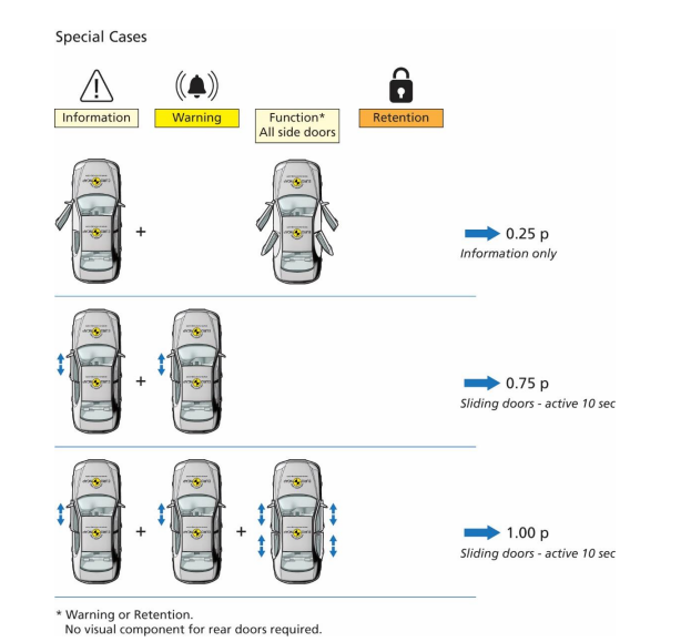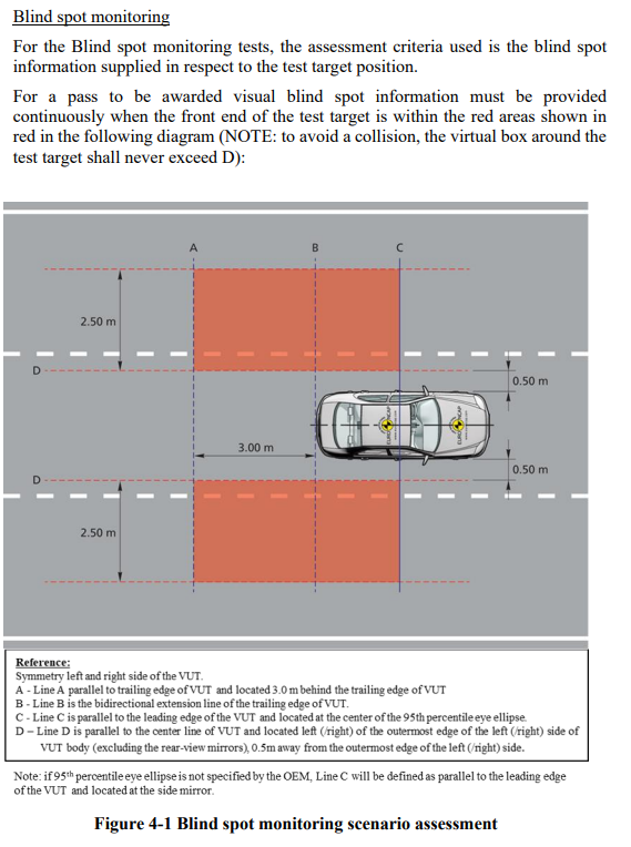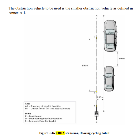 Door opening (manually operated): Pull door handle or activate other door opening interface (e.g. push a button) in a manner that would open the door to exit the car in a normal non-hazard situation, while pushing the door open. Emergency exit functions are permitted where triggered by an additional action (e.g. second pull). For CBDA, all tests shall be performed with the VUT in parking position within 60 seconds (180 seconds from 2026 onwards) after propulsion system turned off with the driver in unbelted state. The widest outside structure (without mirrors) of VUT and obstruction car are aligned one meter from the path of the VRU while the central-axis of the cars are in parallel to VUT path. The distance between VUT and obstruction car is currently 2m and is intended to be lowered from 2026 onwards.