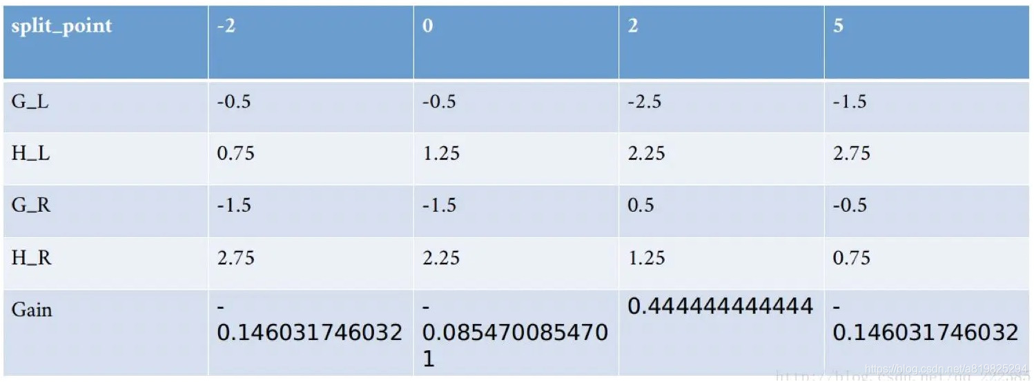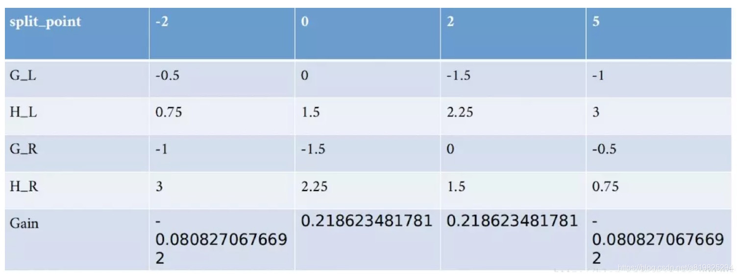 G a i n = 1 2 [ G L 2 H L + λ + G R 2 H R + λ − ( G L + G R ) 2 H L + H R + λ ] − γ = 0.111111111 Gain = \frac{1}{2} [\frac{G^{2}_{L}}{H_{L}+\lambda} + \frac{G^{2}_{R}}{H_{R}+\lambda} - \frac{(G_{L}+G_{R})^2}{H_{L}+H_{R}+\lambda}] - \gamma = 0.111111111 Gain=21[HL+λGL2+HR+λGR2−HL+HR+λ(GL+GR)2]−γ=0.111111111