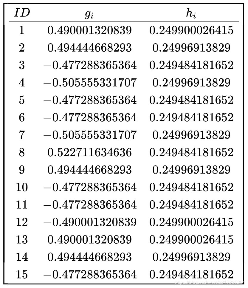 g i = y i , p r e d − y i ; h i = y i , p r e d ∗ ( 1 − y i , p r e d ) g_{i} = y_{i,pred}-y_{i};h_{i} = y_{i,pred}*(1-y_{i,pred}) gi=yi,pred−yi;hi=yi,pred∗(1−yi,pred)
