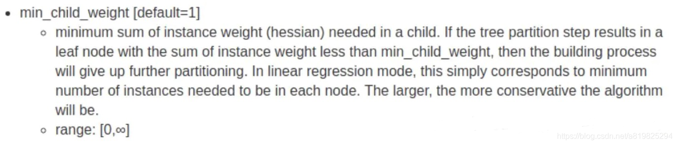如果我们设置min_child_weight=0.26的时候,分裂点就不是选择10,而是放弃这个最大收益,考虑次最大增益。如果次最大增益也不满足min_child_weight<min ( H L , H R ) (H_{L},H_{R}) (HL,HR),则继续往下找,如果没有找到一个满足的,则不进行分裂。(在上面中min_child_weight取的0,所以只要是最大的增益就选为分裂点)