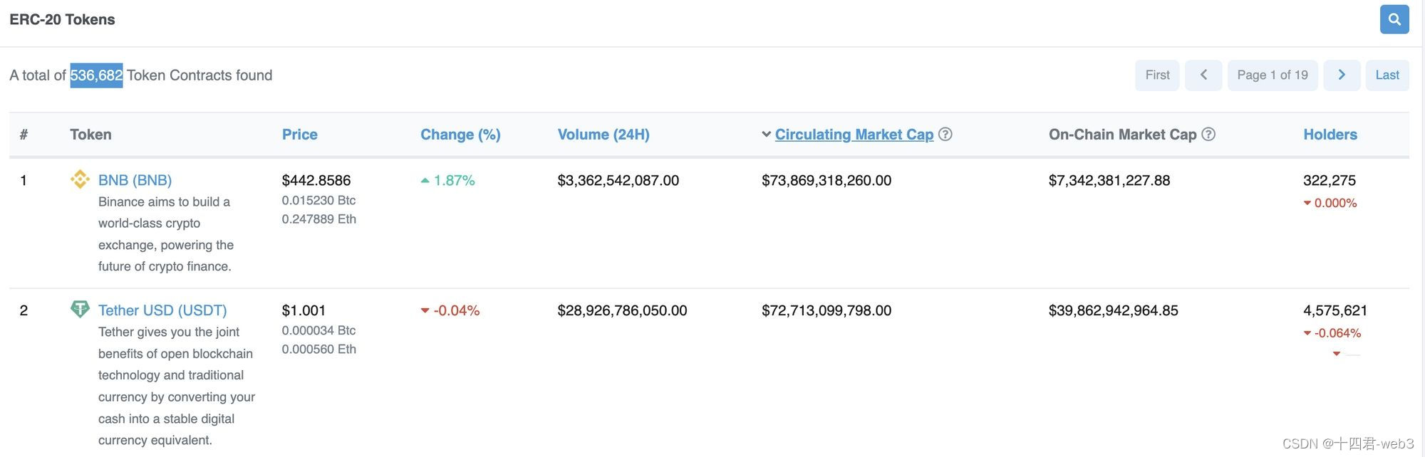 ERC20头部信息列表:防钓鱼,也可以一览式看到当前符合ERC20的合约有53W种,其中按流通市值排序最大的是BNB以及USDT,其持有地址数量等信息。