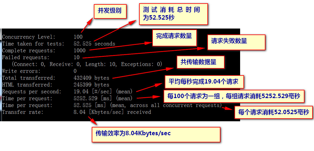 ab主要使用的两个选项就是-n和-c。其他选项使用命令 ab -h 进行查看。