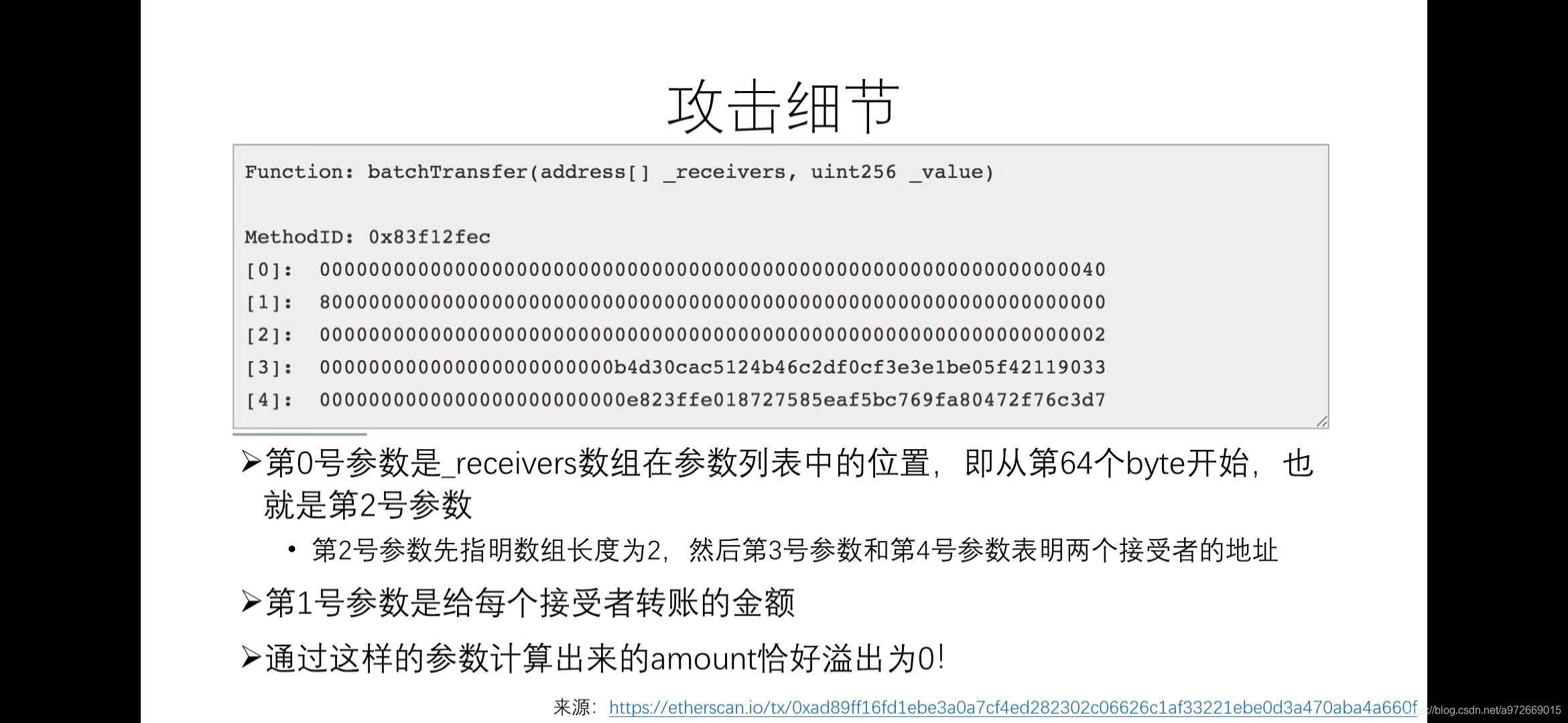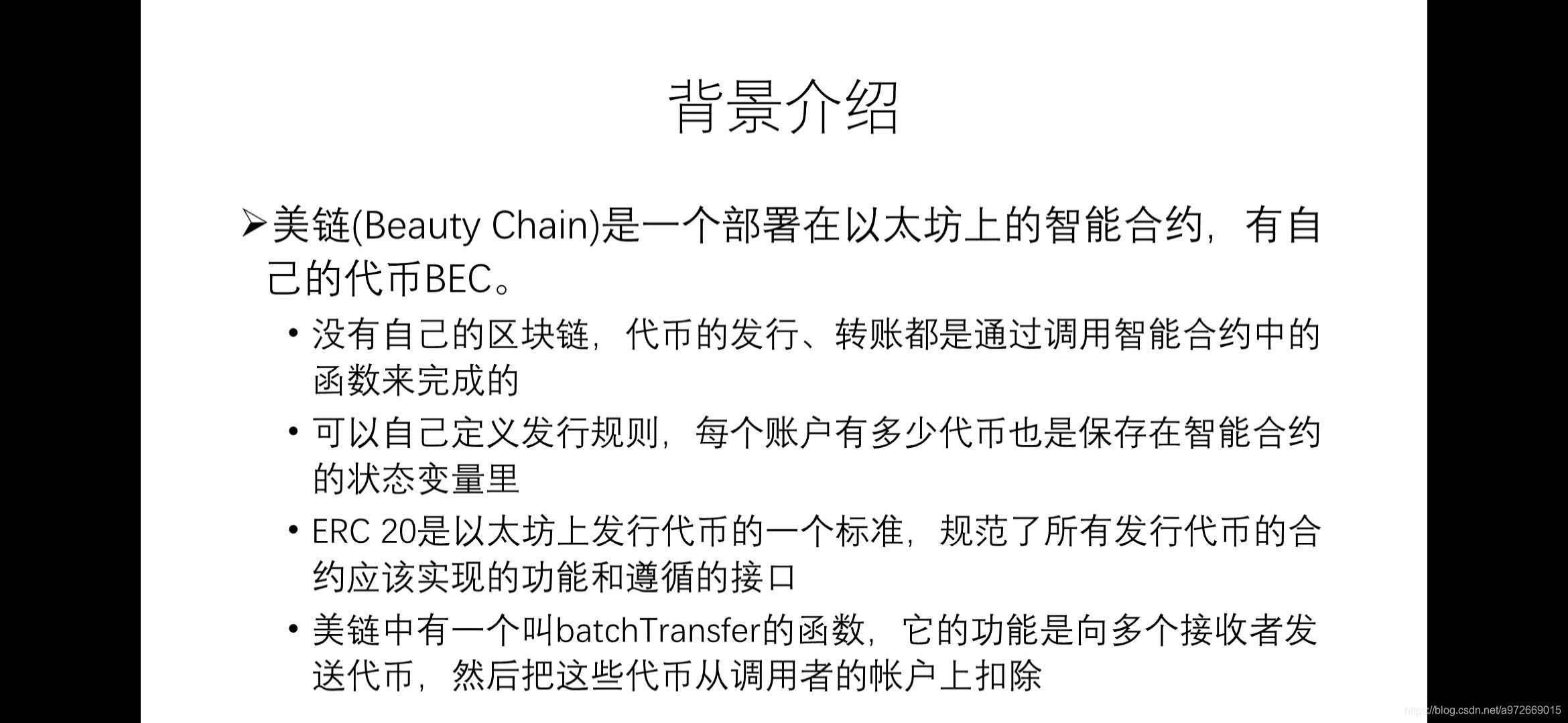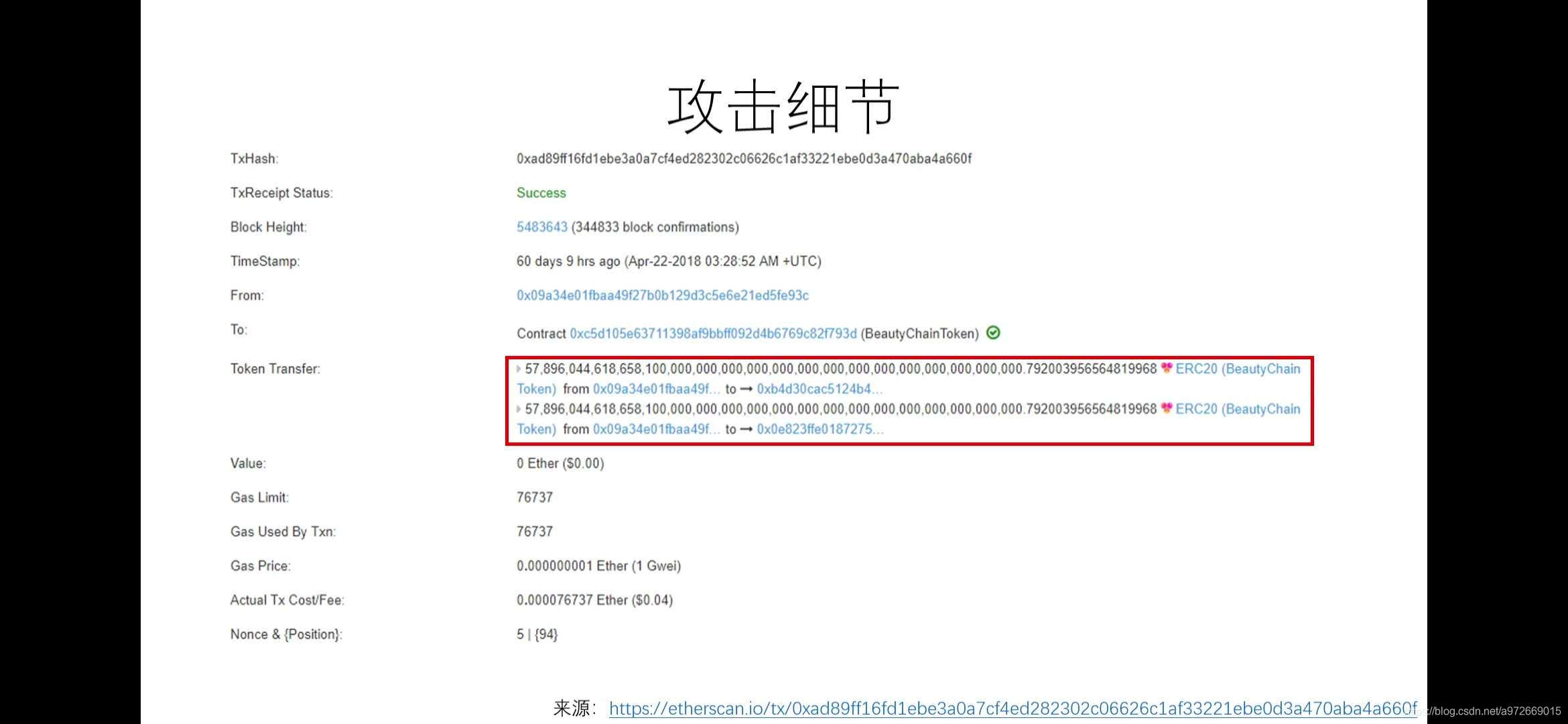 智能合约中又一安全漏洞的例子,于2018.04发生的事件,这个智能合约叫做美链(Beauty Chain)。