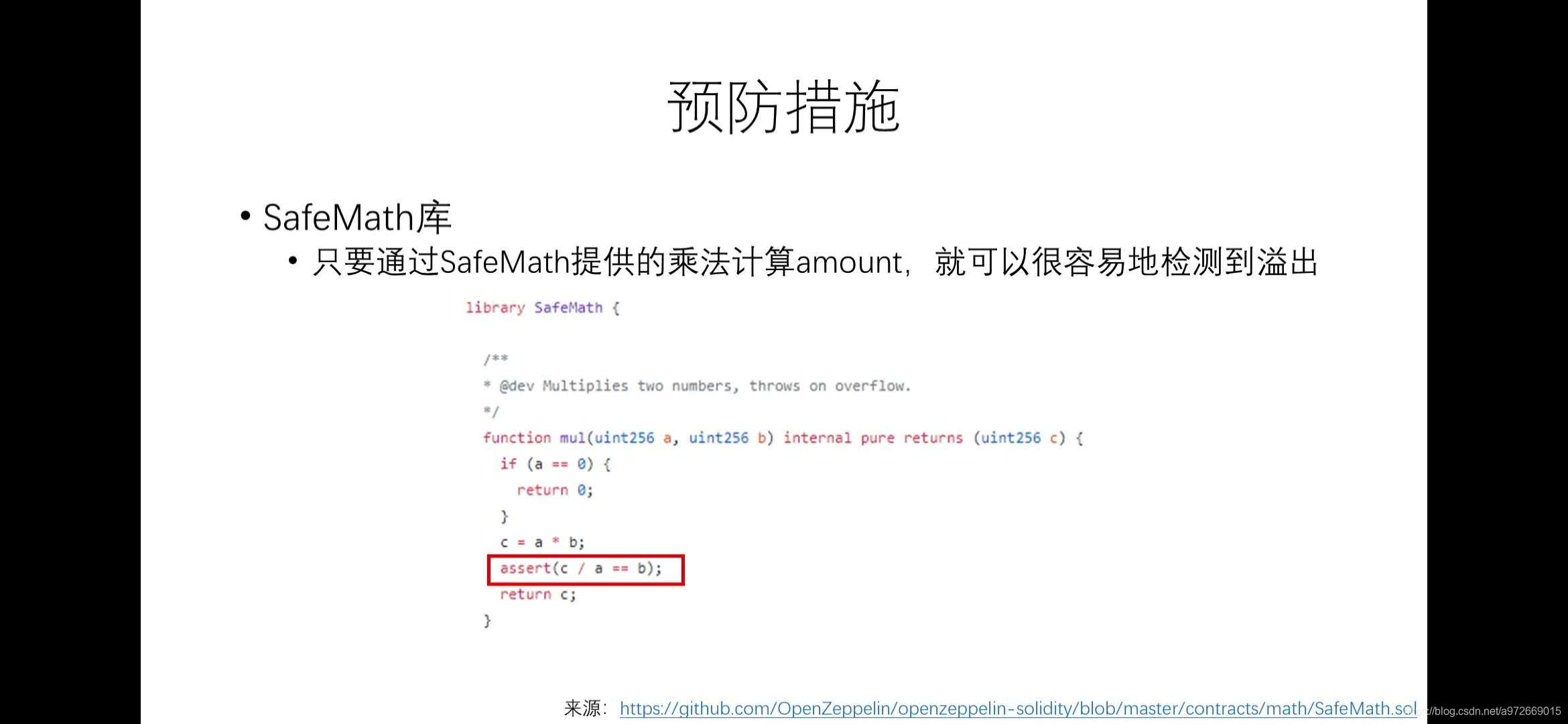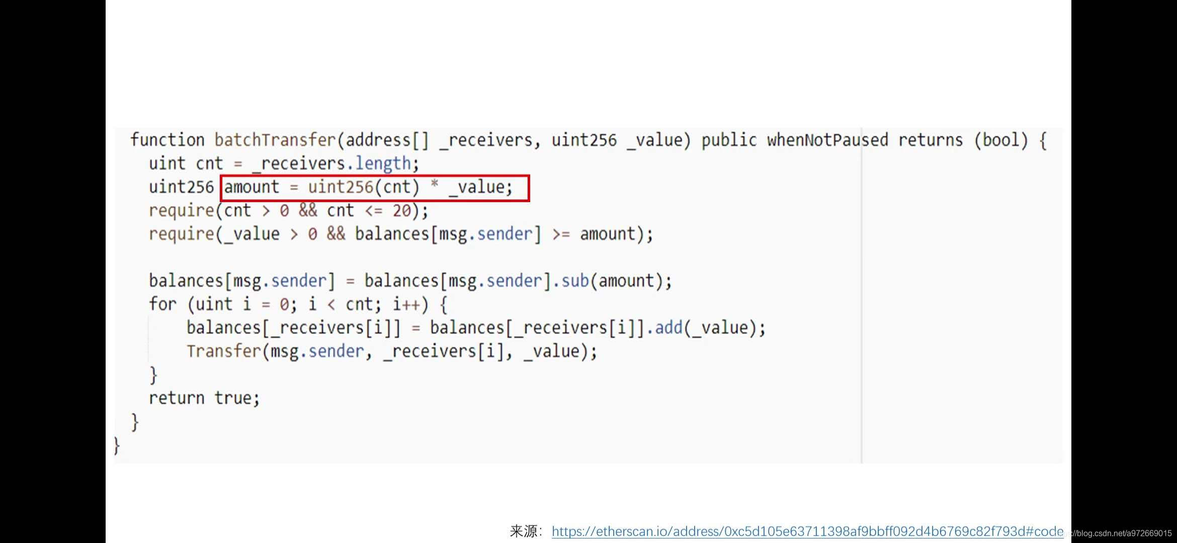问题在于红框中的函数,计算乘法的时候,如果value的值非常大,乘法有可能溢出,溢出之后算出的amount可能是一个很小的值。所以从调用者账户上减的是很小一部分代币,下面仍然是按照很大的value给每个接收者增加代币,最后造成系统中凭空发行了很多代币。