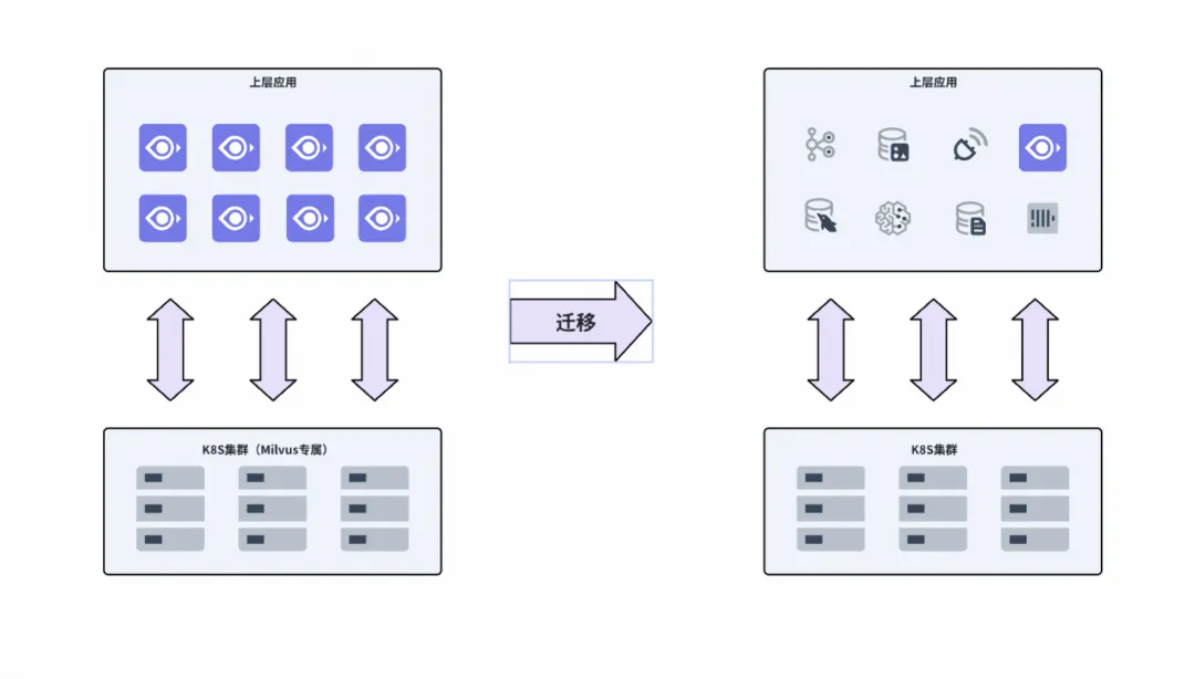 前期为了在性能和稳定性上更好的服务业务,Milvus 部署的底层机器都是独立的,目的就是为了和其他应用隔离开,不相互影响。但是随着集群的越来越多,并不是所有的集群对稳定性和性能要求那么高,从监控上看 Milvus 集群池的资源使用不超过 10%。为了提高公司资源利用率,我们将独立部署的 Milvus 迁移高共享资源池中,和大数据、业务应用等 K8S 部署相关服务进行混合部署。