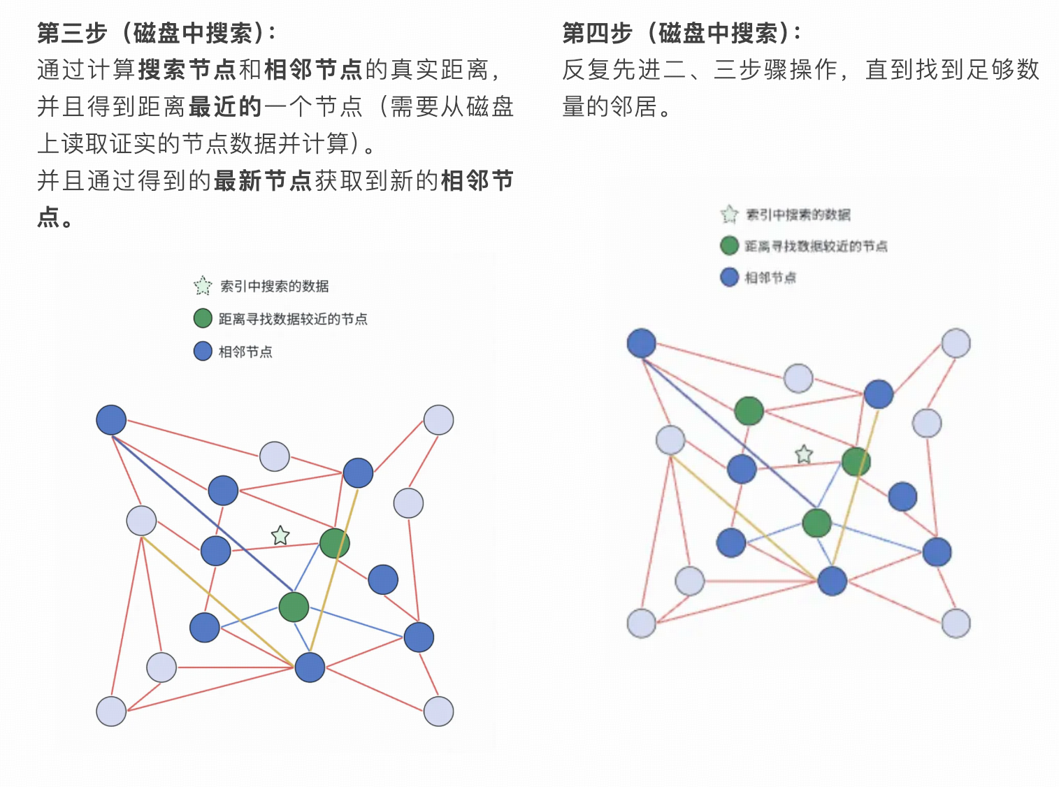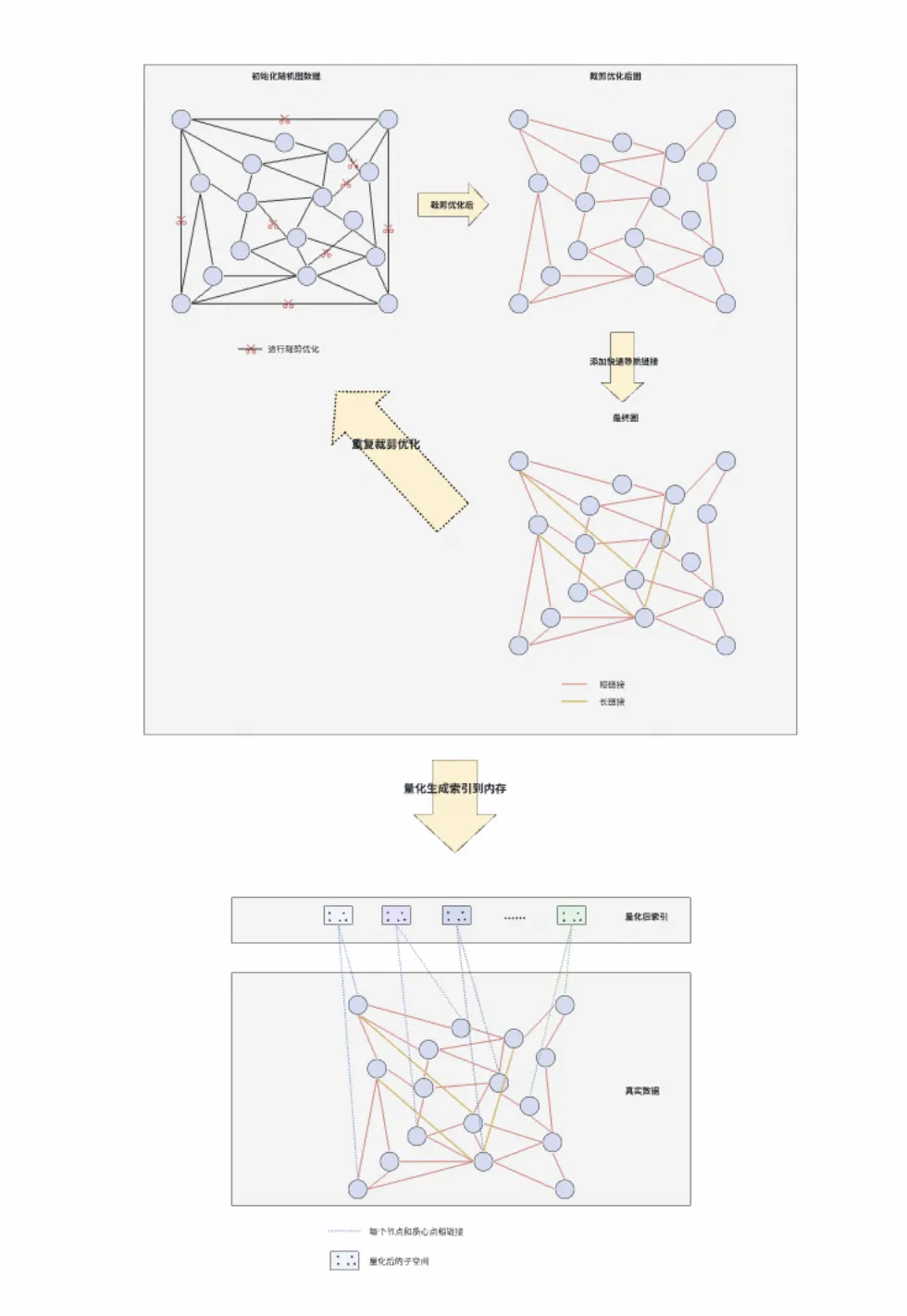 - 初始化随机连接:DiskANN 算法会将向量数据生成一个密集的网络图,其中点和点是随机链接的,并且每个点大概有 500 个链接。
