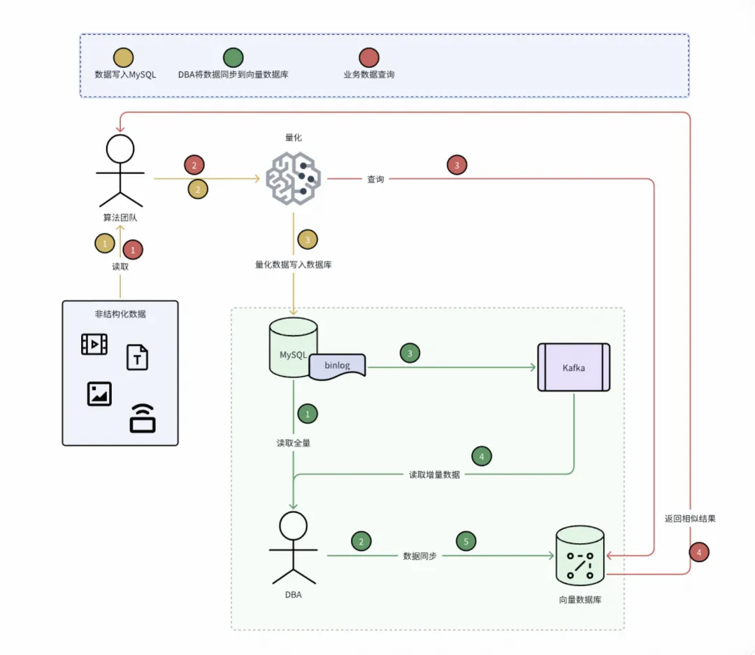 数据迁移闭环:对于业务数据加载到向量数据库的场景,业务只关心数据的读取和使用,不需要关心数据的量化和写入。DBA 侧建立数据迁移闭环(下图绿色部分)。