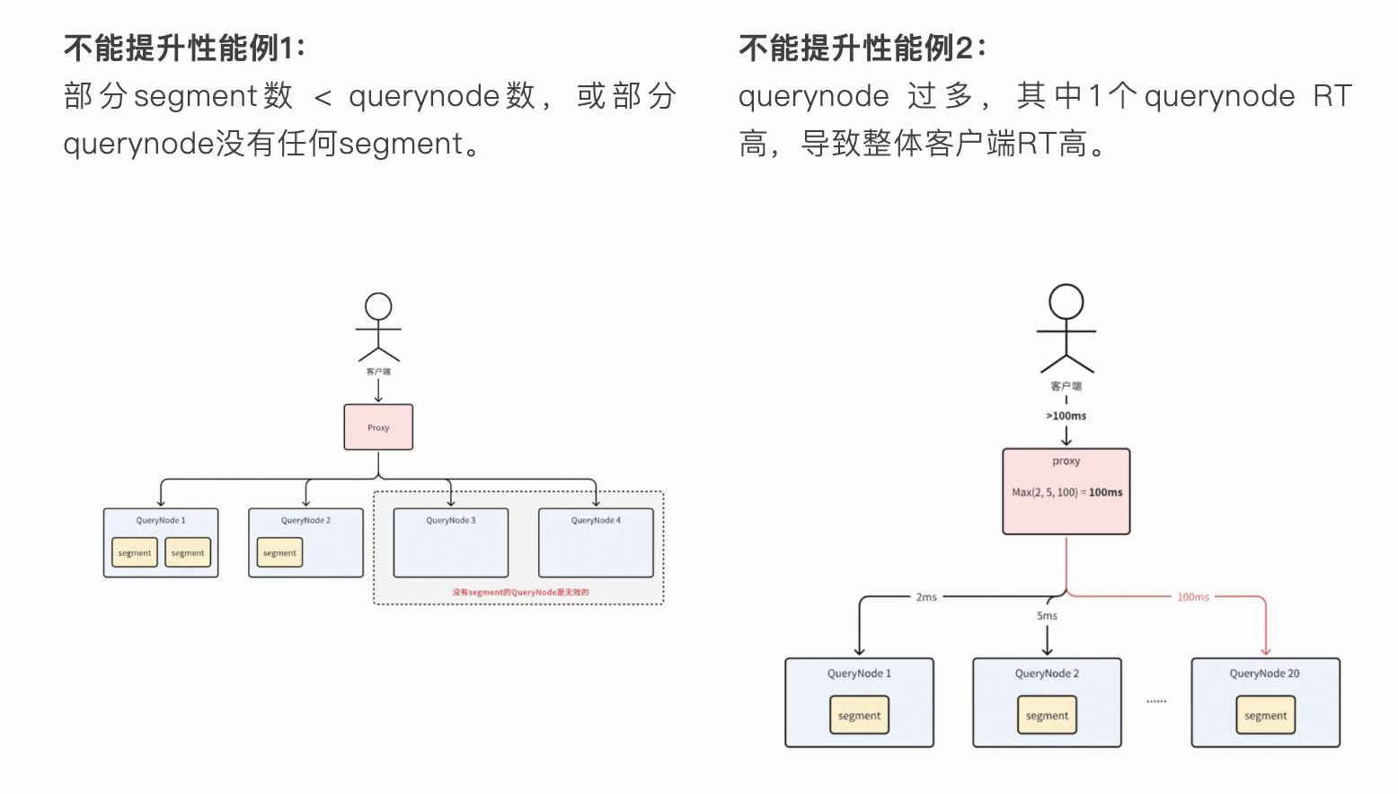 ※误区原因 将 querynode 看成 redis cluster,增加节点数能提高查询并发,然而并不是。redis cluster 增加节点,数据量会尽可能的打散到每个节点中,所以增加节点和性能提升是相对成正比。但是 milvus 不一样,milvus 打散的基本单位是 segment,一般 segment 大小 (1G / 个),他的粒度比 redis cluster 要大。理论上的理想情况是 1 个 segment 对应 1 个 querynode,但是实际情况会收到多因素的干扰,会导致 querynode 越多出现不稳定的概率越大,如某个 querynode 网络抖动会影响整体的查询 RT。