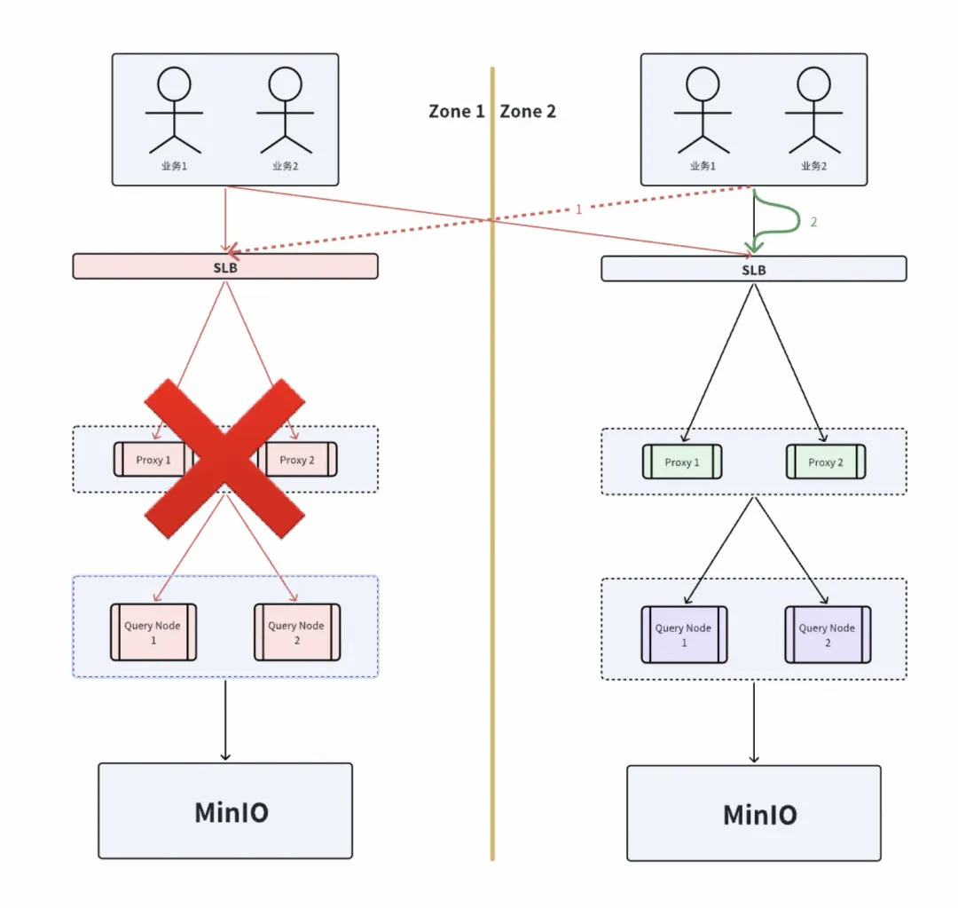 整个 Zone 不可用: 当 Zone1 整个不可用,不影响 Zone2 的访问。