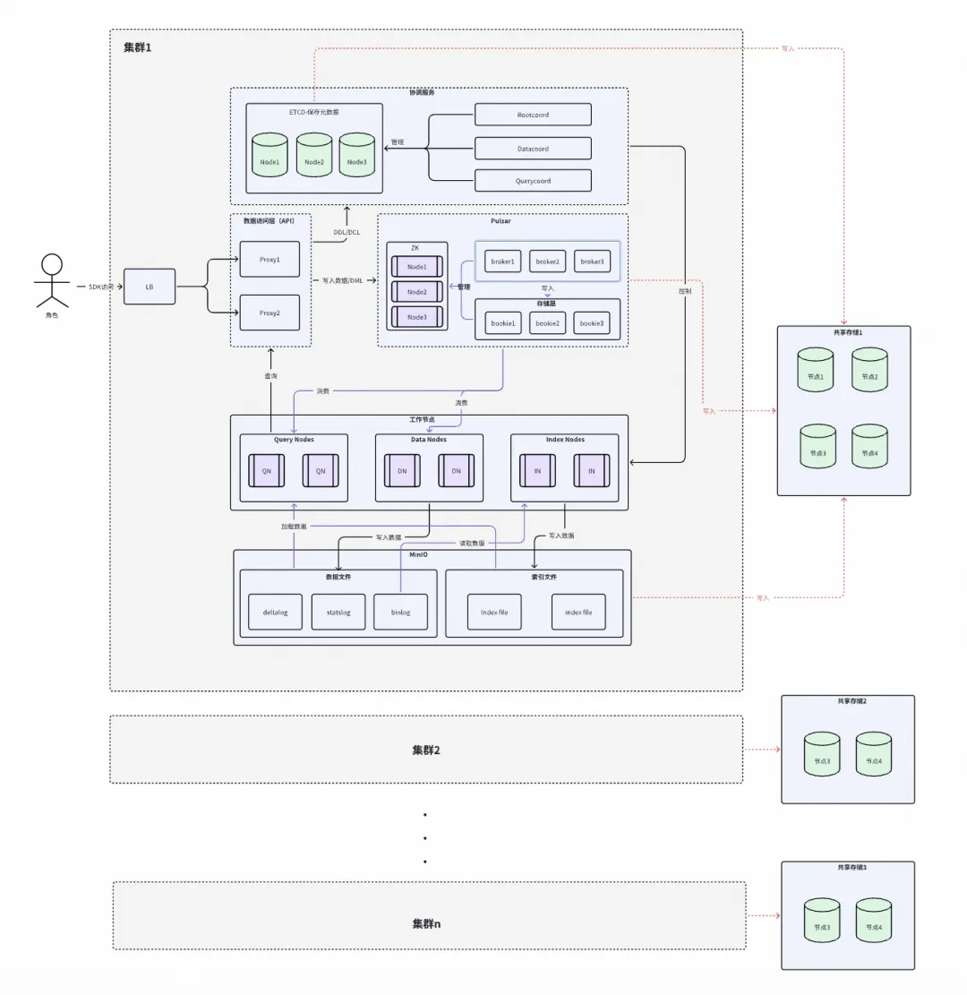 初始阶段,我们把 Milvus 部署在 K8S 上,默认使用 HNSW 索引。架构图如下,Milvus 整个架构较为复杂,外部依赖的组件多,每个集群需要部署自己的 ETCD、ZK、消息队列模块,多套集群共享着同一个存储。