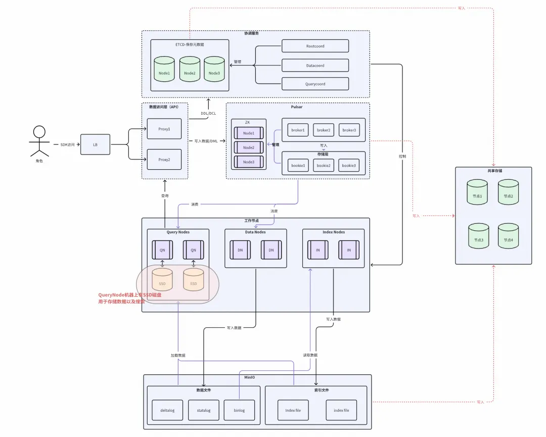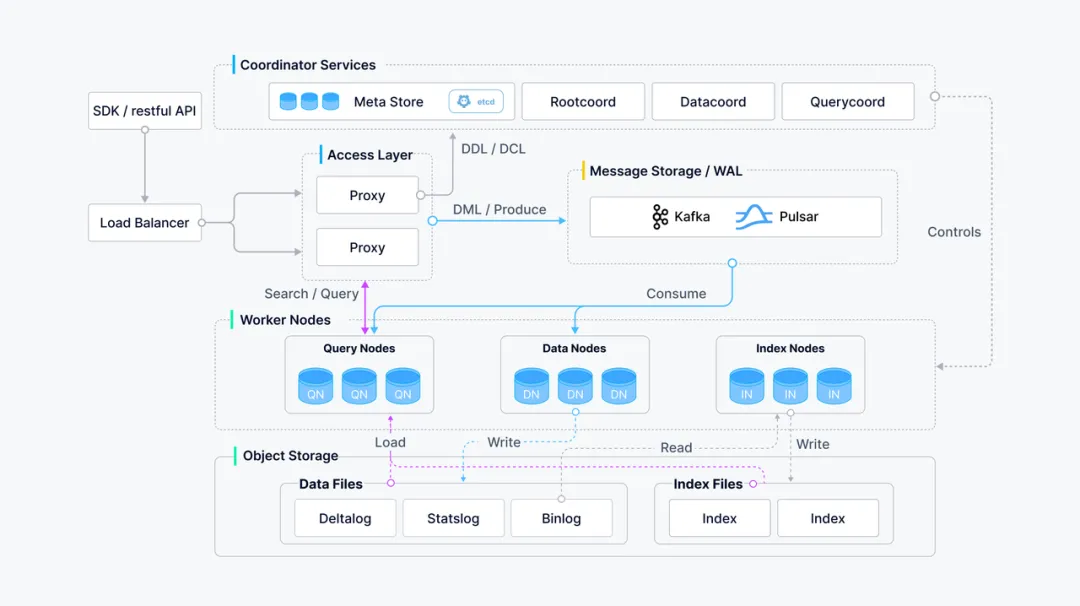 Milvus 架构:Milvus 部署依赖许多外部组件,如存储元信息的 ETCD、存储使用的 MinIO、消息存储 Pulasr 等。