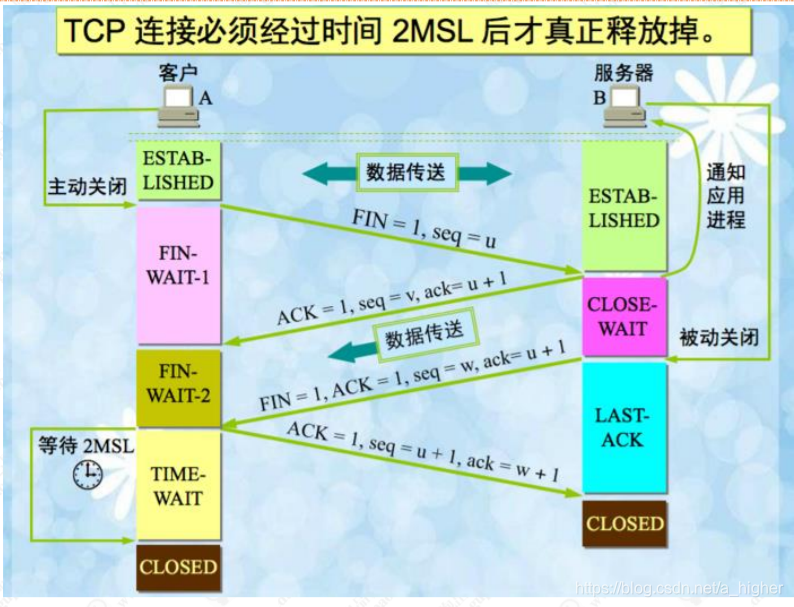 第一次挥手(FIN=1,seq=x) 假设客户端想要关闭连接,客户端发送一个 FIN 标志位置为 1 的包,表示自己已经没有数据 可以发送了,但是仍然可以接受数据。发送完毕后,客户端进入 FIN_WAIT_1 状态。 第二次挥手(ACK=1,ACKnum=x+1) 服务器端确认客户端的 FIN 包,发送一个确认包,表明自己接受到了客户端关闭连接的请求, 但还没有准备好关闭连接。发送完毕后,服务器端进入 CLOSE_WAIT 状态,客户端接收到这 个确认包之后,进入 FIN_WAIT_2 状态,等待服务器端关闭连接。 第三次挥手(FIN=1,seq=w) 服务器端准备好关闭连接时,向客户端发送结束连接请求,FIN 置为 1。发送完毕后,服务器 端进入 LAST_ACK 状态,等待来自客户端的最后一个 ACK。 第四次挥手(ACK=1,ACKnum=w+1) 客户端接收到来自服务器端的关闭请求,发送一个确认包,并进入 TIME_WAIT 状态,等待 可能出现的要求重传的 ACK 包。 服务器端接收到这个确认包之后,关闭连接,进入 CLOSED 状态。 客户端等待了某个固定时间(两个最大段生命周期,2MSL,2 Maximum Segment Lifetime) 之后,没有收到服务器端的 ACK,认为服务器端已经正常关闭连接,于是自己也关闭连接, 进入 CLOSED 状态。