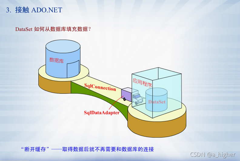 白话说:adapter去把数据从数据库拿到应用程序,先建立连接,设置sql去操作数据库,得到数据放到dataset,这个适配器模式,把command作为成员变量,dataset作为参数传入