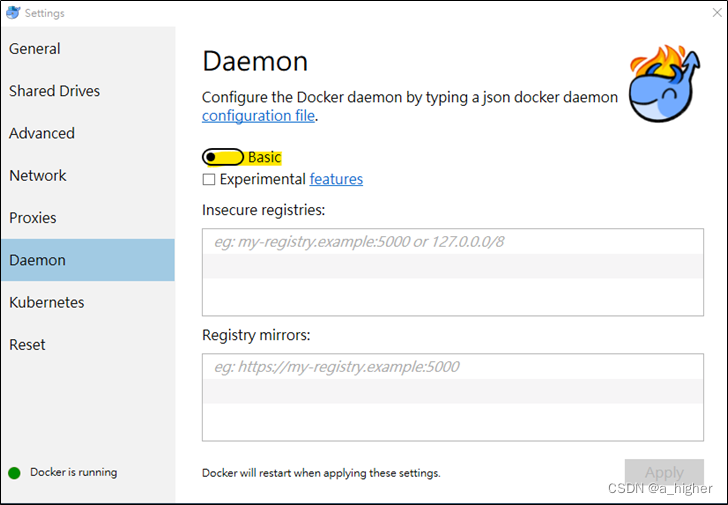 需要改变默认docker地址(默认image地址应该是C:\ProgramData\Docker\windowsfilter,改变地址后image存放的目录应该会是设定目录下的windowsfilter这个目录,我这个没实操过)的可以点击basic,让它变advance