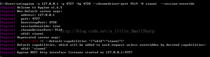 命令行中输入:appium -a 127.0.0.1 -p 4727 -bp 4728 --chromedriver-port 9519 -U xiaomi --session-override