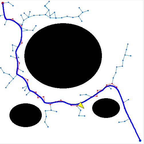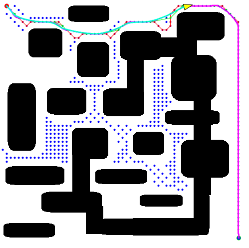 【路径规划】辅助点与多段贝塞尔平滑RRT 在上一篇关于贝塞尔曲线平滑路径的文章中,只是大致的介绍了一下贝塞尔曲线的原理,并且初步测试了一下,最终平滑的效果,还是不尽人意的,最开始是使用了简易的多段二阶贝塞尔,得到的曲线有很多的尖锐:然后使用了全局的贝塞尔,也就是所有的点全一次用上,得到一个N阶贝塞尔,但是这样就会有一个缺点,那就是当转弯很多的时候,它的效果就并不那么好了,就像这样:有时就会出现上述的情况,比较容易压到障碍,并且与原路径差别较大。那么在实际的贝塞尔优化路径的使用中,经常使用的方法可以直接告诉大家:使用多段五阶贝塞尔 + 插辅助点的方法