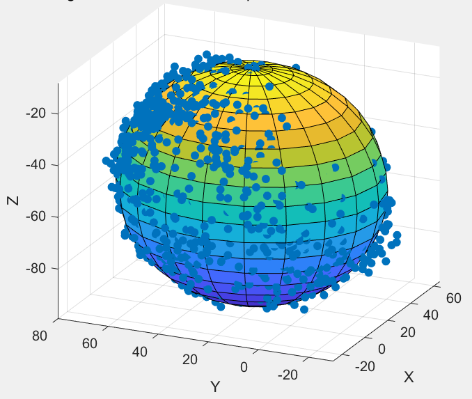 【传感器】最小二乘法实现磁力计椭球校准 磁力计的数据在实际中是椭球的形状,在此之前使用了球体拟合进行校准,也就是简化为正球体的模型,得出的结果比较差,航向计算不准,还是需要用椭球的模型来估计偏移量,先使用标准的椭球方程,进行化简与变形,得到最小二乘法可以进行估计的标准形式,之后对原始数据进行最小二乘法矩阵的赋值,求解方程,最终观察拟合效果。但使用此方程会有问题,可以求出多个解,使用matlab求解的话,很容易就会求出异常的解,也就是Rx,Ry,Rz很大的时候,也是会满足方程的,但这个解肯定是不对的。实际输出为:y = φT * θ。