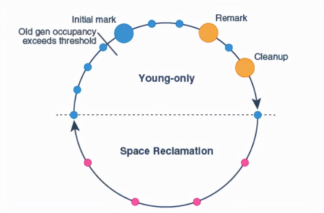 - 初始标记:这个过程除了普通的 young-only GC 外,还会开始并发标记过程,这个过程决定了被标记的老年代存活对象在下一次space-reclamation阶段会被保留。这个过程不会STW,有可能标记还没有结束普通的 young-only GC 就开始了。这个标记过程需要在重新标记(Remark)和清理(Cleanup)两个过程后才能结束。