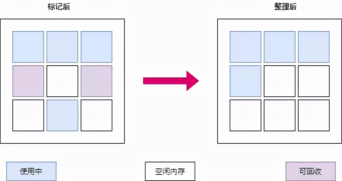 - 标记整理:G1主要使用标记整理算法来进行垃圾收集,标记阶段跟“标记清除”算法一样,但标记之后不会直接对可回收对象进⾏清理,⽽是让所有存活对象都移动到一端,然后直接回收掉移动之后边界以外的内存。如下图: