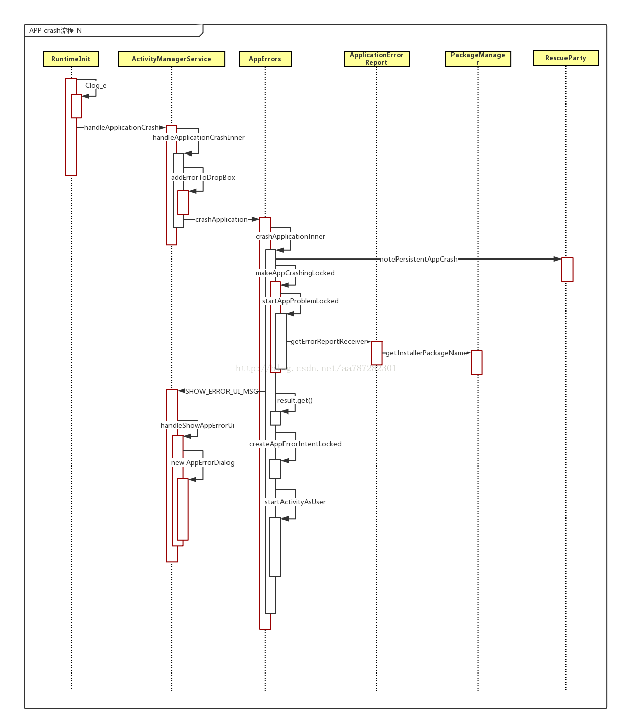 a persistent app is stuck in a crash”来说,appCrash的流程这里就不多说了,看一张时序图好了: