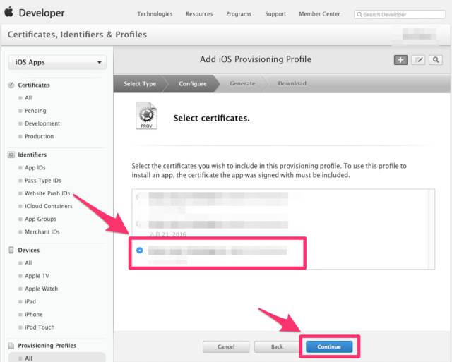 4.选择你刚创建的发布证书(或者生成p12文件的那个发布证书),点击Continue