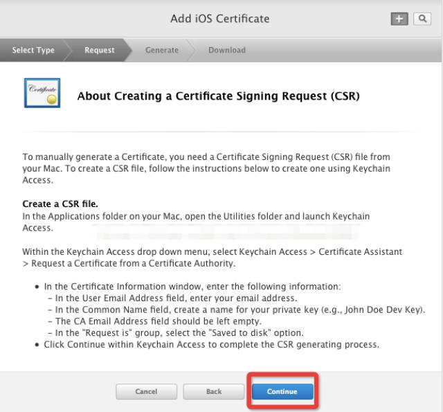 发布证书和开发者证书需要分别创建,操作两次,开发者证书用于真机调试,发布证书用于提交到AppStore。