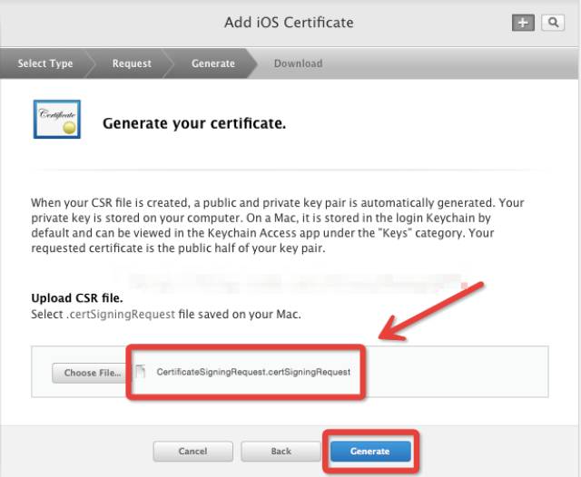 5. 点击choose File.. 选择创建好的证书请求文件:CertificateSigningRequest.certSigningRequest 文件,点击Generate