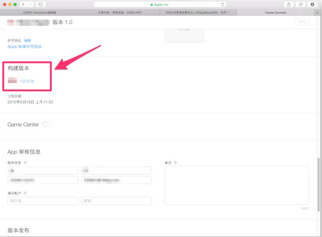 此时这个构建版本还没有生成,我们先把基本信息填写完毕,然后再进入Xcode中把项目打包发送到过来。注意:填写完一定要点击右上角的保存。