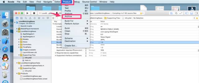 4、Archive在线打包,在真机状态下选择Product——>Archive,如果不是真机状态下,Archive会是灰色不可用的)。