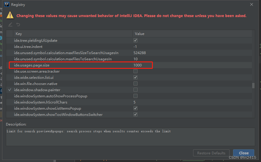 【IDEA修改全局搜索数量限制】 Ctrl+shift+A + /快键键 -> 选择 Registry -> 找到ide.usages.page.size 修改值 即可。File->Settings -> Advanced Settings -> maxnum number 修改值即可。