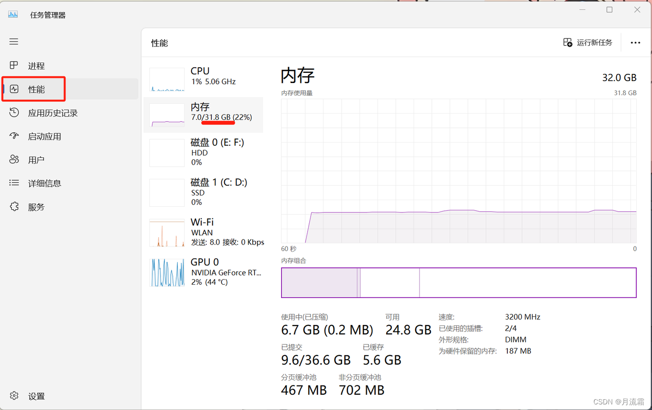 ②看到性能里面的内存,后面这个数字就是我们电脑的运行内存,也就是图片中划线的数字