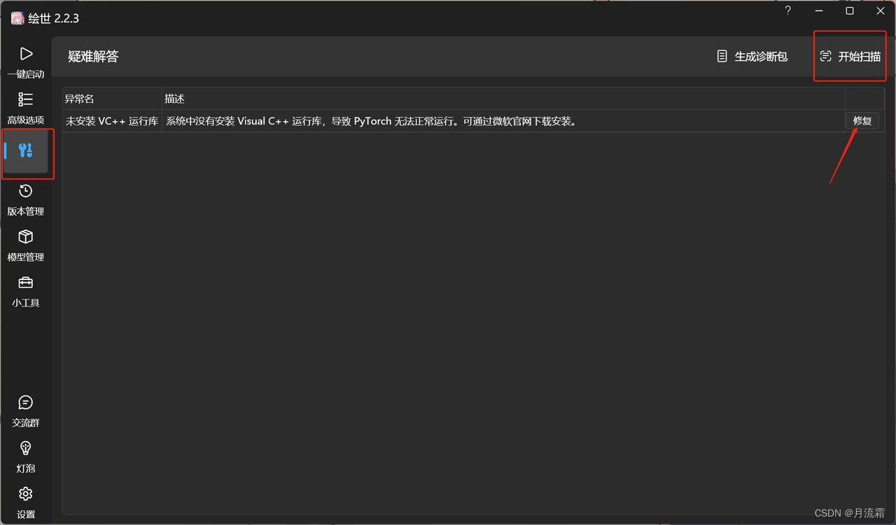 在左边点击“疑难解答”,再点击右边的“开始扫描”