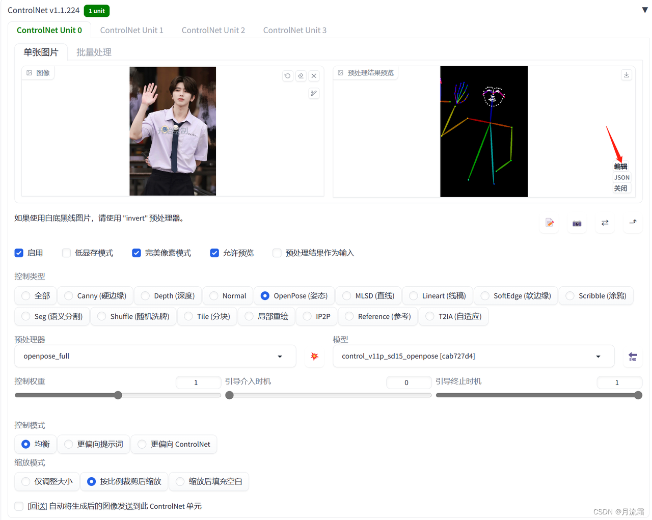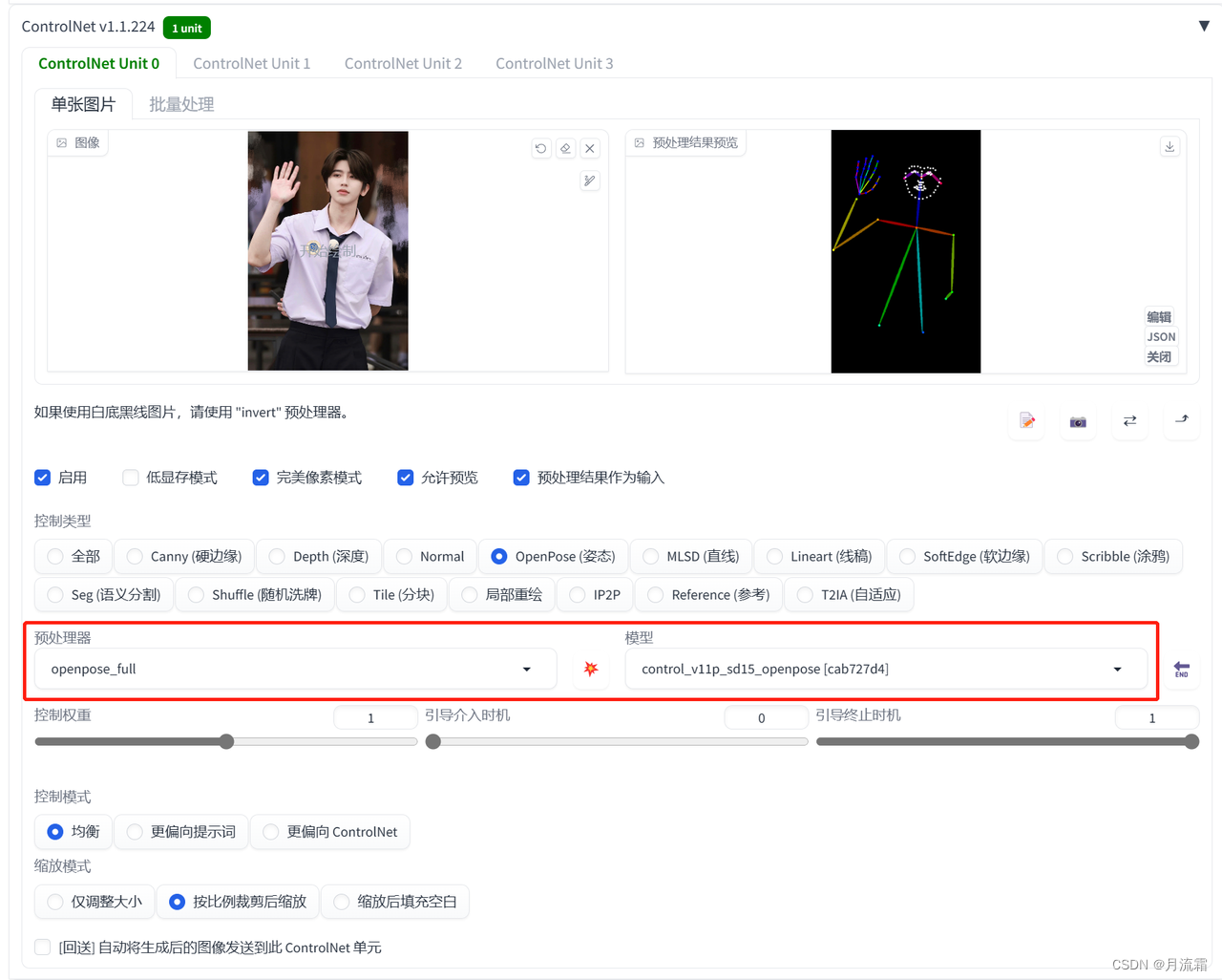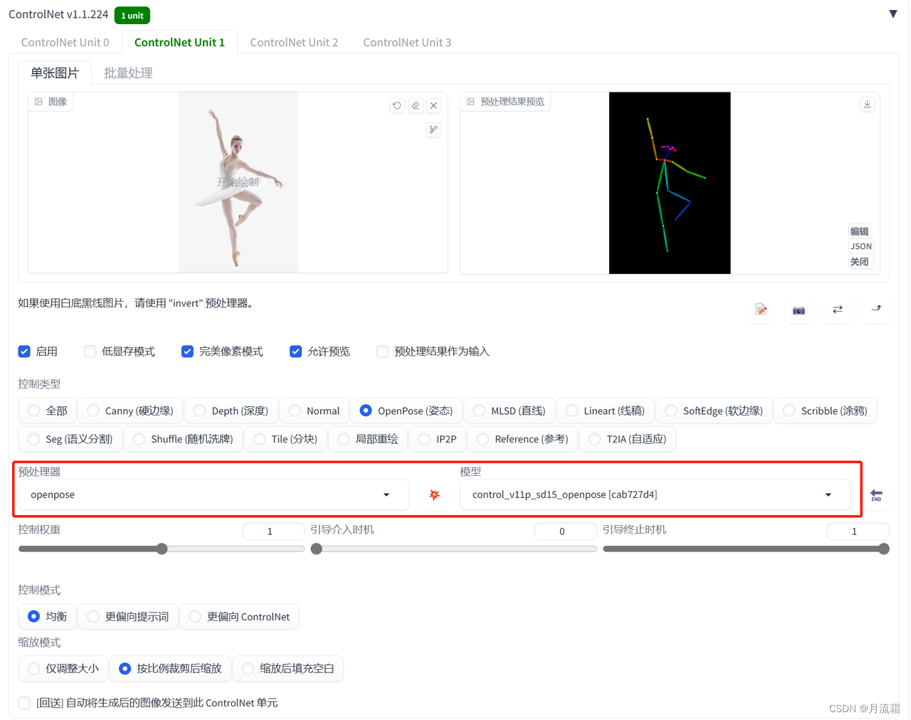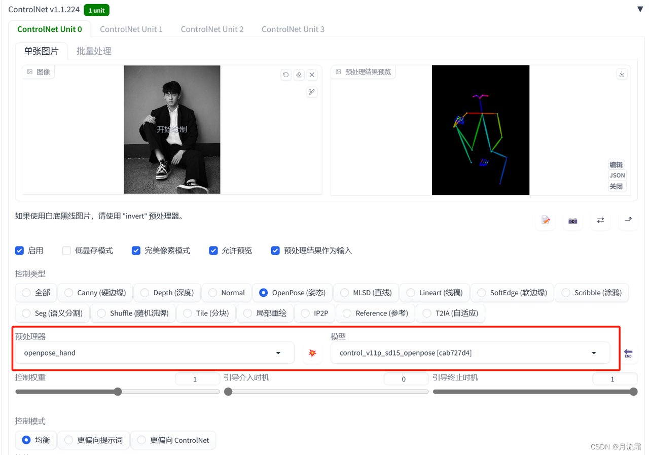 controlnet的不同功能的实现其实就是上传不一样的照片,然后选用不一样的预处理器和模型