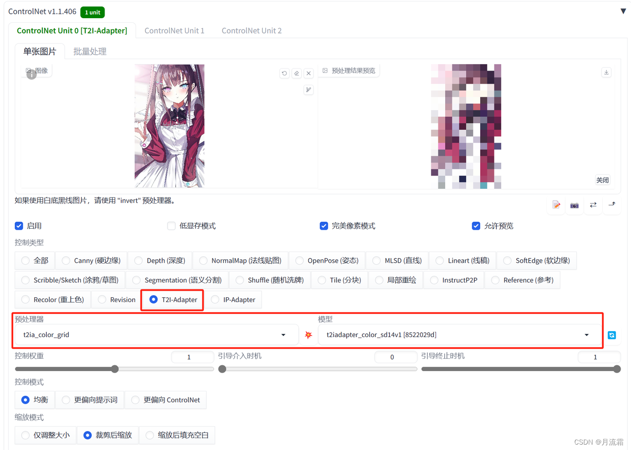 预处理器:t2ia_color_grid 模型:t2iadapter_color