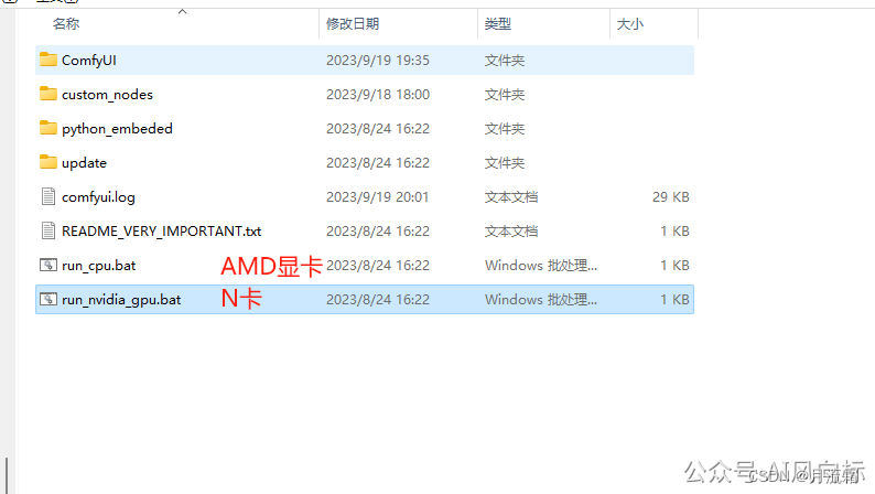 1.解压comfyui windows文件夹,推荐N卡使用,使用run gpu 运行,A卡只能双击run cpu运行