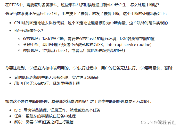 ISR是一个特殊的函数,当特定的中断事件发生时,CPU会自动跳转到这个函数执行。ISR的主要目标是尽快响应中断事件,执行必要的硬件操作(如清除中断标志位),然后可能通过某种机制(如发送信号量、向消息队列发
