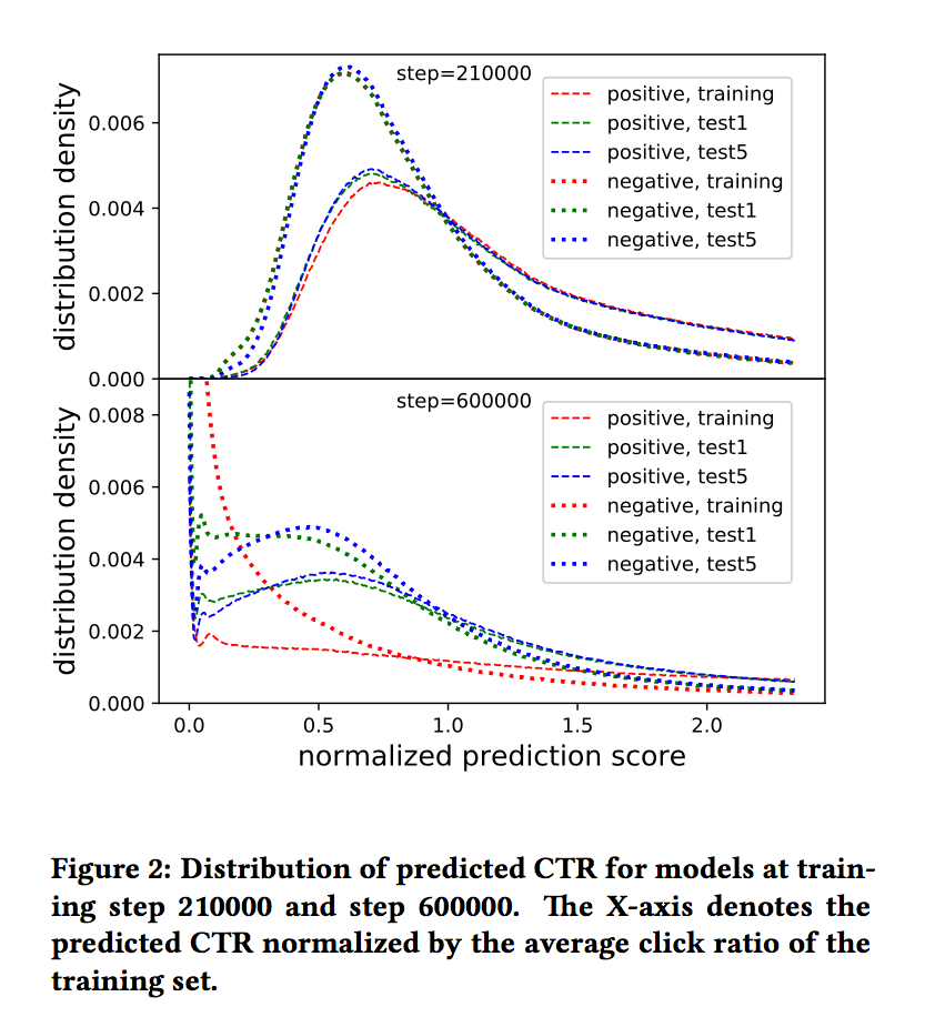 下图展示了在210000轮和600000轮时,训练集、test1和test5的标准化预测值(预测值pCTR/训练集的真实CTR)的变化。