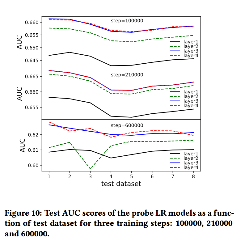 可以看到,从第一到第三层,隐层输出信息对于点击行为的区分力逐层提升。第四层并没带来明显收益,与上节的结论一致。